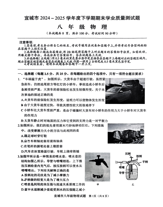 2024-2025学年湖北襄阳宣城市八年级下册物理期末真题(图片版)