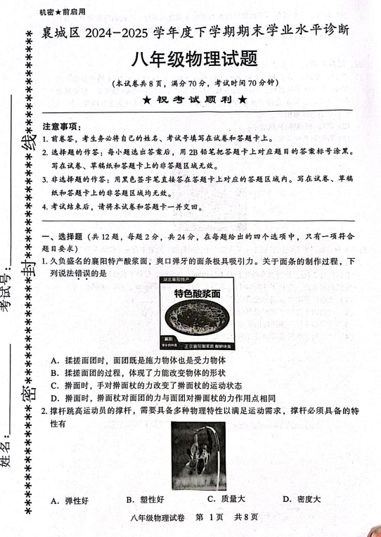 2024-2025学年湖北襄阳襄城区八年级下册物理期末真题(图片版)