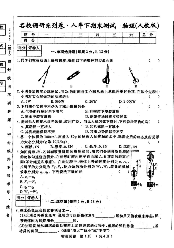 2024-2025学年吉林吉林船营区二十三中学八年级下册物理期末真题(图片版)