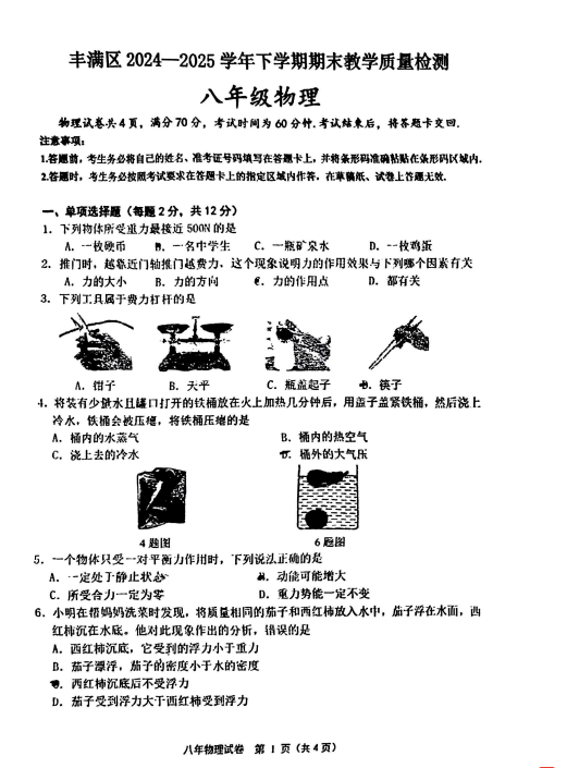2024-2025学年吉林吉林市丰满区八年级下册物理期末真题(图片版)