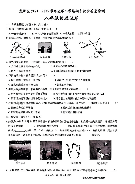 2024-2025学年吉林吉林市龙潭区八年级下册物理期末真题(图片版)