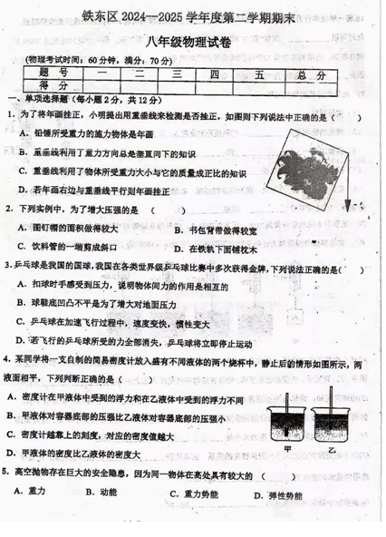 2024-2025学年吉林四平铁东区八年级下册物理期末真题(图片版)