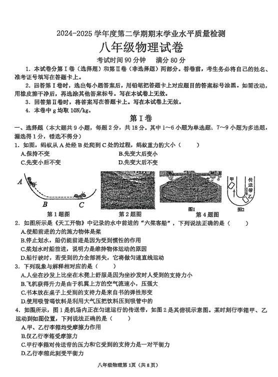 2024-2025学年辽宁朝阳建平县八年级下册物理期末真题(图片版)