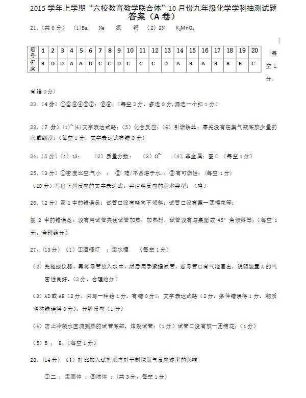 2015年上学期番禺区10月份六校联考化学答案