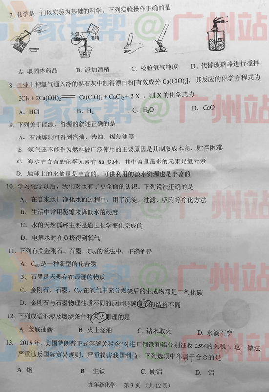 2018-2019学年广州荔湾区初三期末化学试题(图片版)(3)