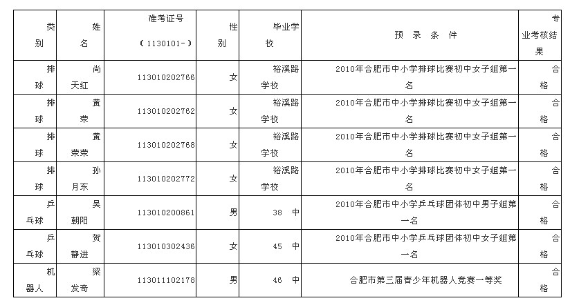 合肥五中2011年特长生预录名单公示