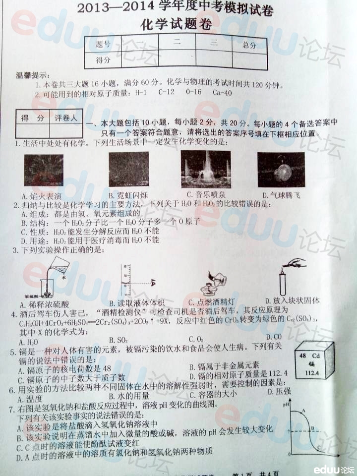 试卷下载:2014年合肥中考一模合肥50中化学卷.doc