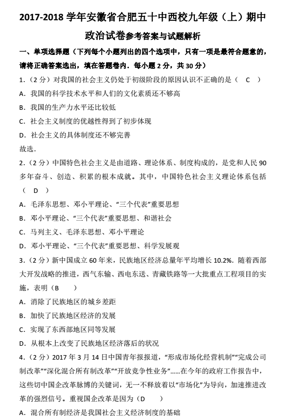 2017-2018学年上学期合肥五十中西校九年级期中考试政治答案