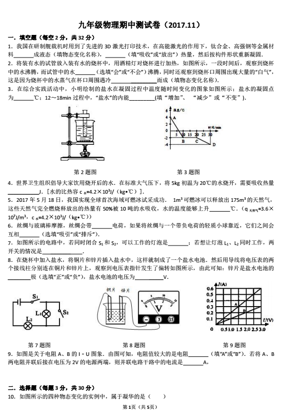 2017-2018学年上学期合肥行知学校九年级期中考试物理试题
