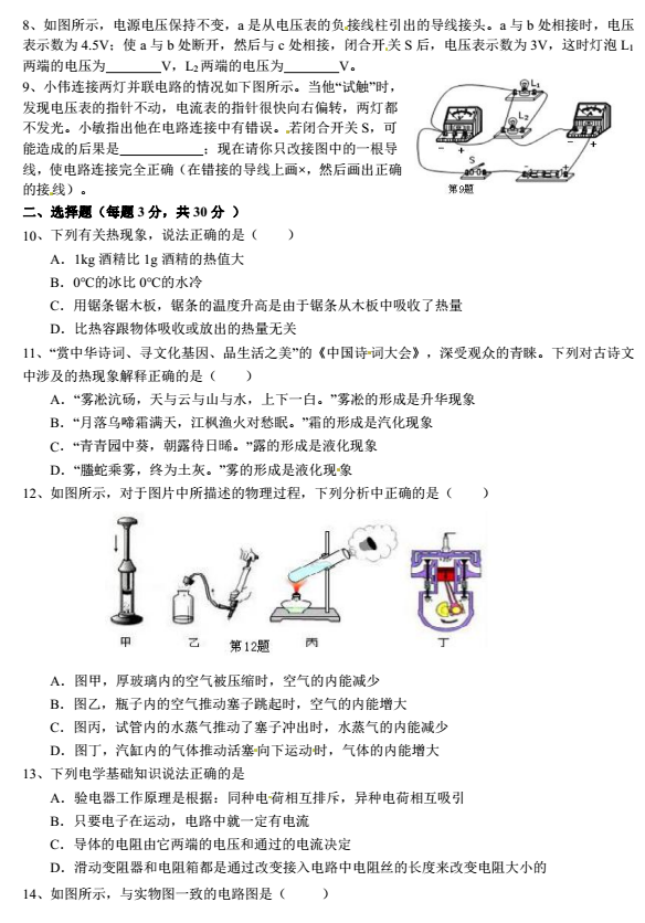 2017-2018学年上学期合肥五十中西校九年级期中考试物理试题(2)