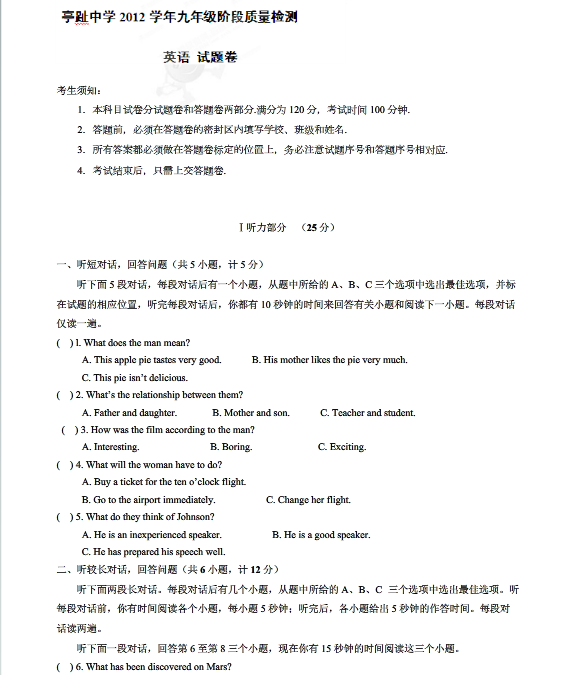运河镇亭趾实验学校2013届初三上期末英语试题