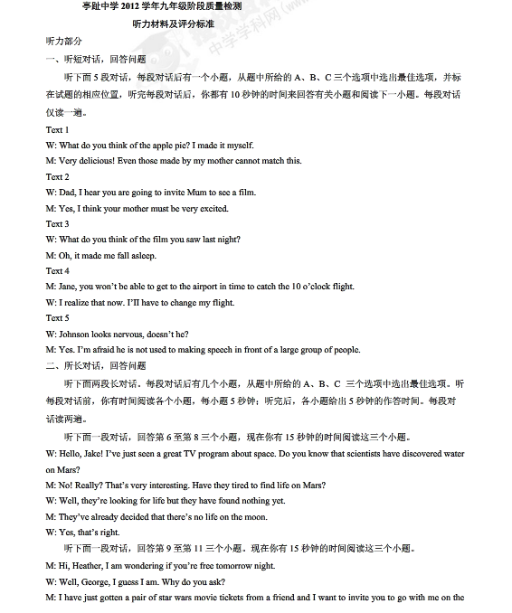运河镇亭趾实验学校2013届初三上期末英语答案