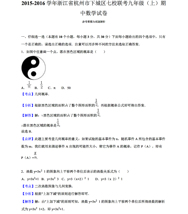 下城区七校联考2016届九年级上期中数学答案