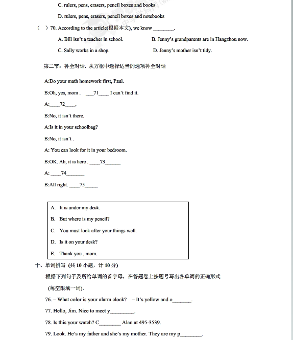 周浦中学2015-2016学年初一上期中英语试题(7)