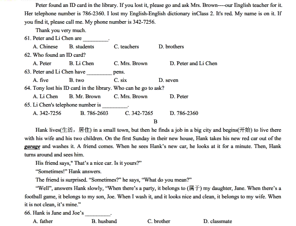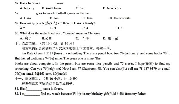 杭州地区2015-2016学年初一上期中英语试卷(4)