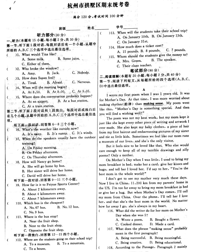 杭州拱墅区2015-2016学年初三上期末英语试卷
