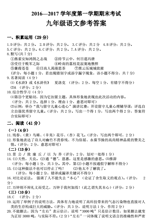 杭州萧山区良才学校2016-2017学年九年级上期末语文试题答案