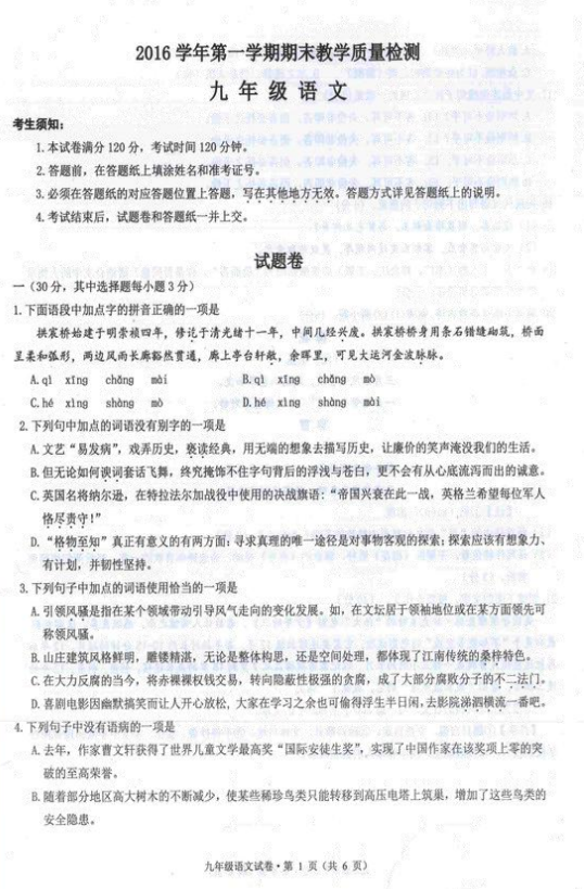 杭州拱墅区2016-2017学年九年级上期末语文试题