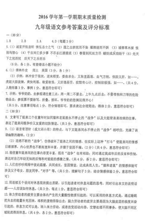 杭州拱墅区2016-2017学年九年级上期末语文试题答案