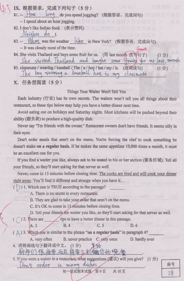 济南外国语学校2012-2013第二学期初一英语期末试题(9)