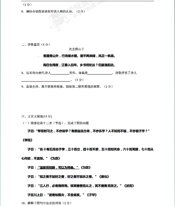 辛锐中学2015-2016学年初一上期中语文试题(3)