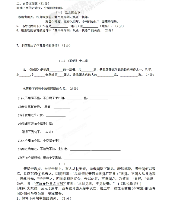 党家中学2014-2015学年初一上期中语文试题(2)
