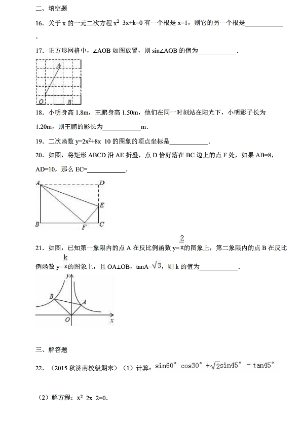济南商河中学2015-2016学年初三上期末数学试卷(4)