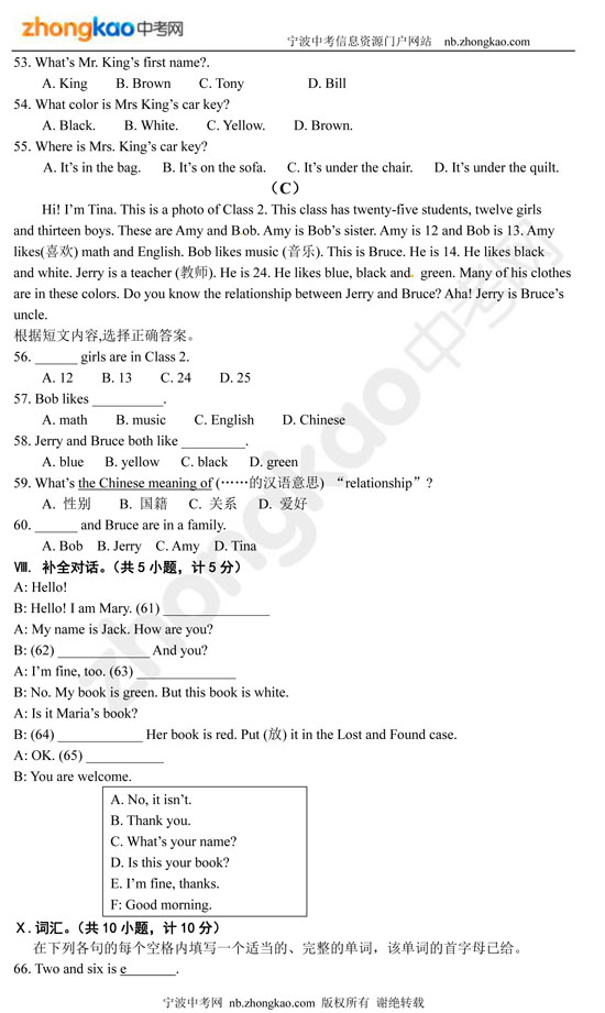 宁波洪塘中学2012学年第一学期初一英语期中试题(5)