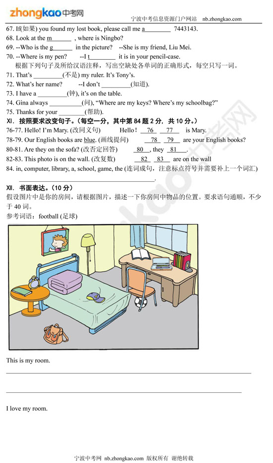 宁波洪塘中学2012学年第一学期初一英语期中试题(6)