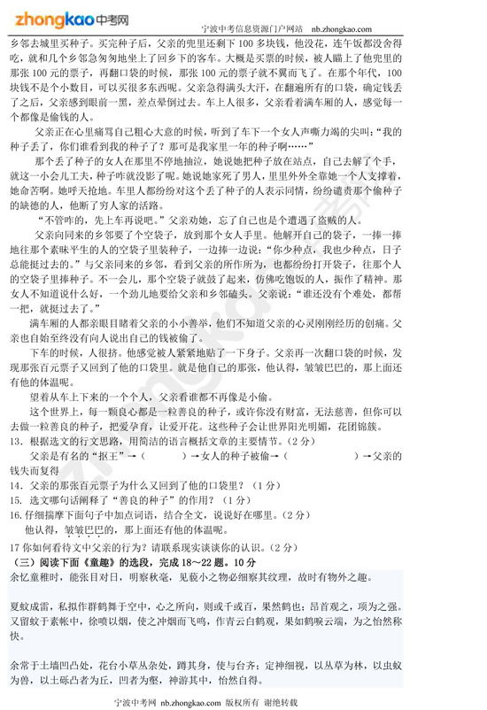 顾国和中学2011学年第一学期初一语文期中试题(3)