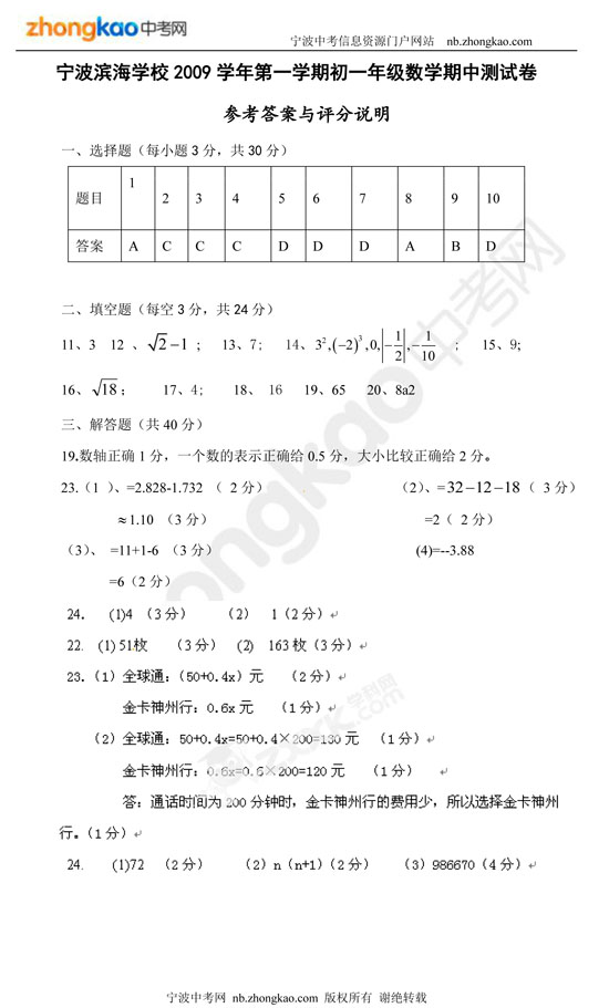 宁波滨海学校2009学年第一学期初一数学期中试题答案
