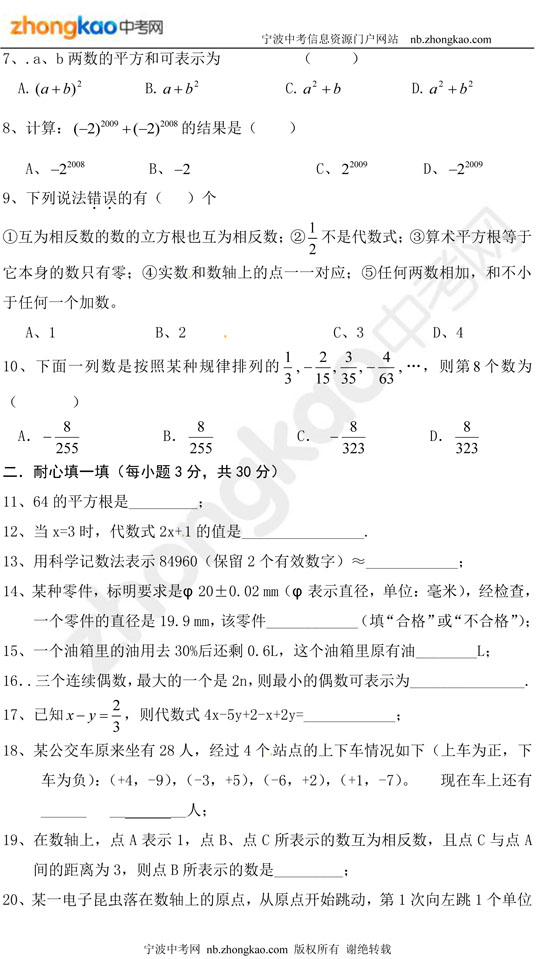 宁波三江中学2012学年第一学期初一数学期中试题(2)