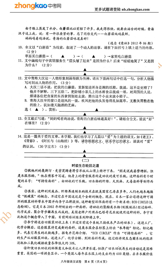 鄞州区2012学年初二上学期期末测试语文试题(4)