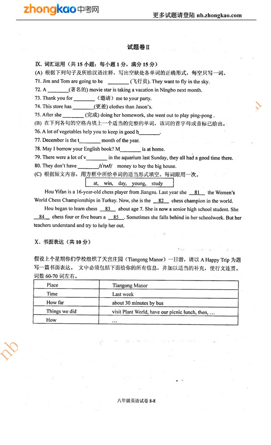 鄞州区2012学年初二上学期期末测试英语试卷(8)