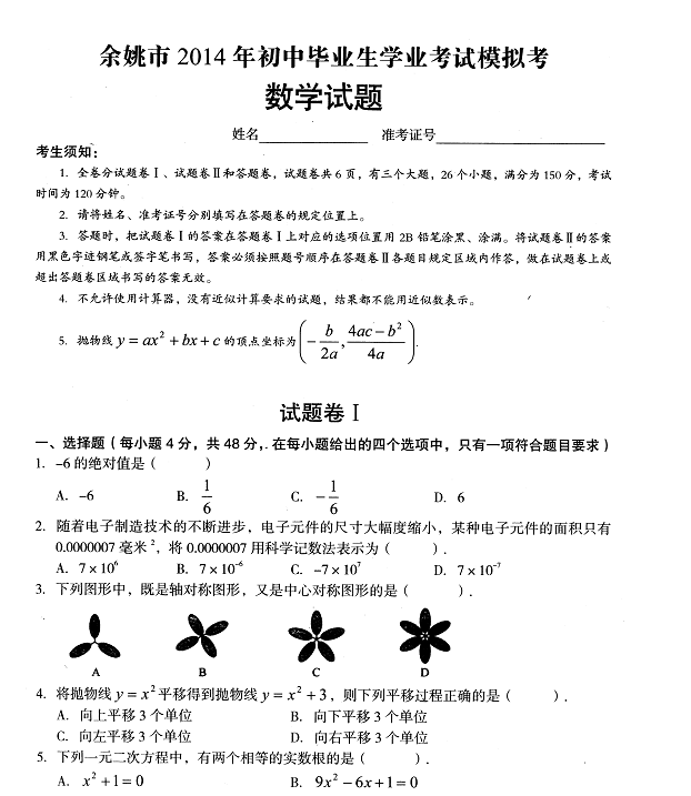 宁波中考网讯 2014年余姚市中考模拟考试的数学试卷和答案已分享至论坛,希望对备战2014中考的考生有所帮助。