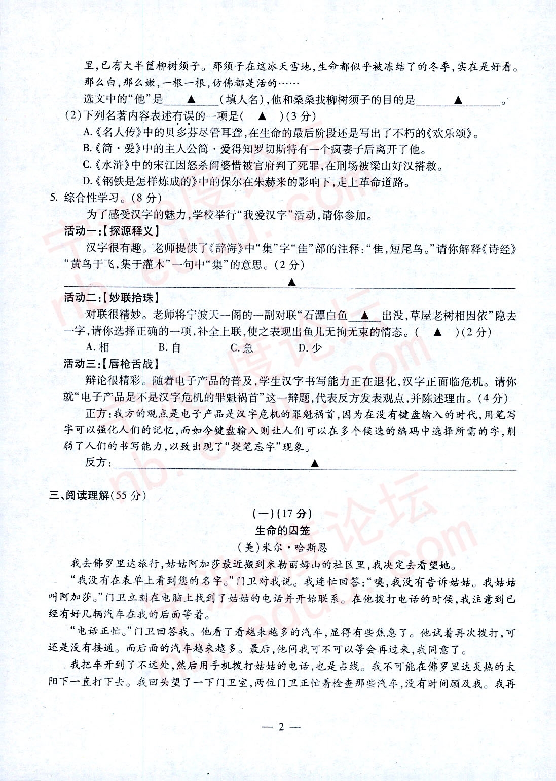 2014年宁波中考语文试题及答案(扫描版,可直接打印)(2)