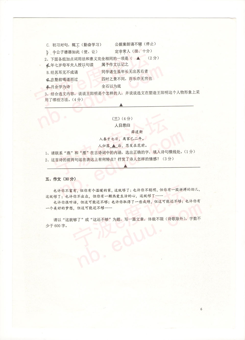 关于【宁外学年度第二学期初二语文期末试卷(含参考答案)(6)】及中考、查分、择校等最新干货资讯,均在家长帮App,还有配套习题及老师免费解答问题,赶快戳我下载 >>>【家长帮App】<<< 相关推荐 2020年中考必备APP「家长帮」免费下载2020年全国中考考试时间汇总2020年全国中考报名时间汇总2020年全国中考大事记2020年中考考前冲刺各科备考全攻略历年全国各省市中考真题及答案历年中考满分作文历年中考录取分数线汇总2020年中考资讯提前看2020年中考政策解读2020年中考政策解读 点击查看更多
