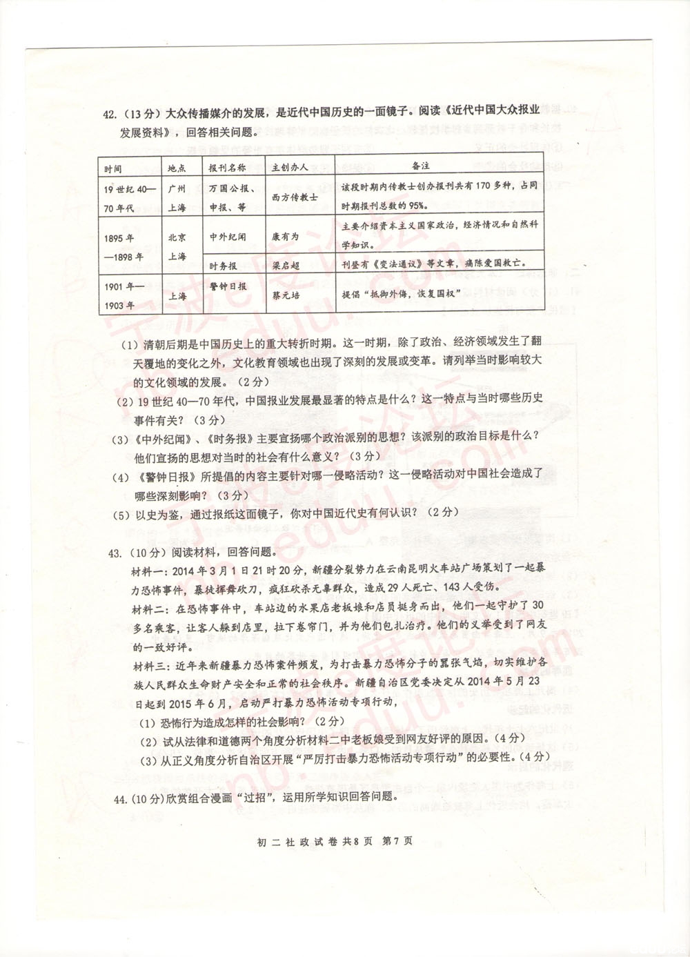 宁外2013学年度第二学期初二社会、思品期末试卷(含参考答案)(7)