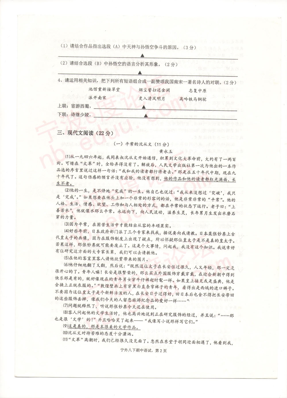 宁外2013学年度第二学期初二语文期中试卷(含参考答案)(2)