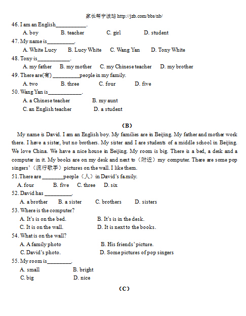 2014-2015年宁波某县市区联考七年级期中英语试题(4)