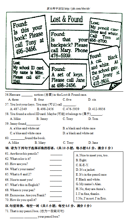 2014-2015年宁波某县市区联考七年级期中英语试题(5)