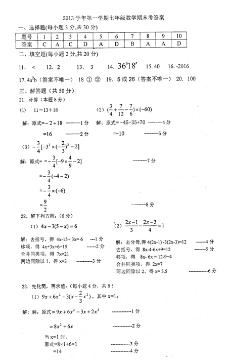 北仑区2013-2014学年上学期七年级期末数学答案