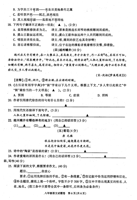 关于【慈溪市学年第一学期八年级期末语文试卷(6)】及中考、查分、择校等最新干货资讯,均在家长帮App,还有配套习题及老师免费解答问题,赶快戳我下载 >>>【家长帮App】<<< 相关推荐 2020年中考必备APP「家长帮」免费下载2020年全国中考考试时间汇总2020年全国中考报名时间汇总2020年全国中考大事记2020年中考考前冲刺各科备考全攻略历年全国各省市中考真题及答案历年中考满分作文历年中考录取分数线汇总2020年中考资讯提前看2020年中考政策解读2020年中考政策解读 点击查看更多