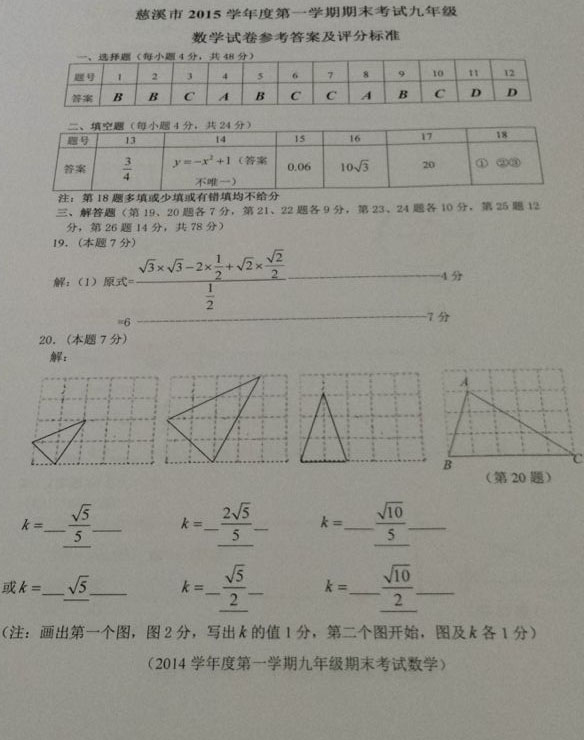 慈溪市2015学年第一学期九年级期末数学答案