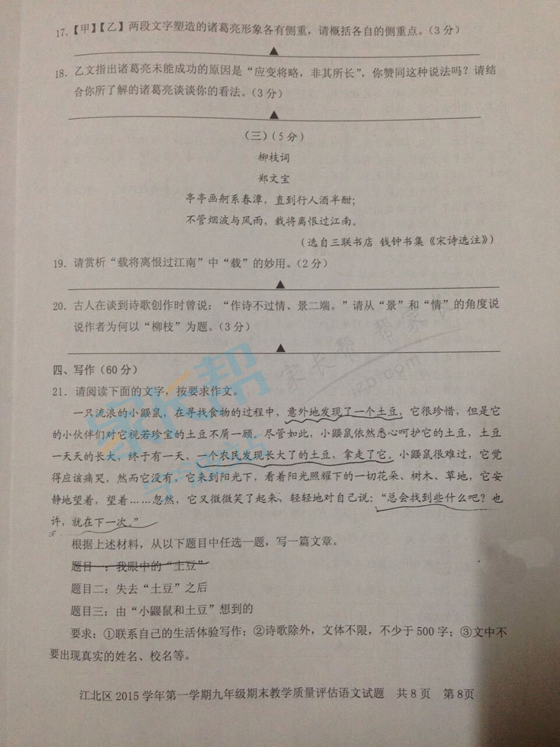 江北区2015学年第一学期九年级期末语文试卷(8)