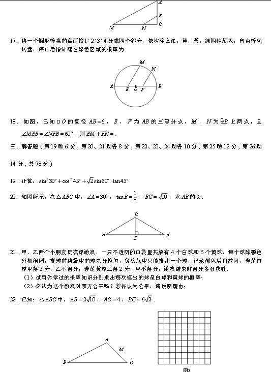 2015年宁波余姚九年级上册期末考试数学卷(4)