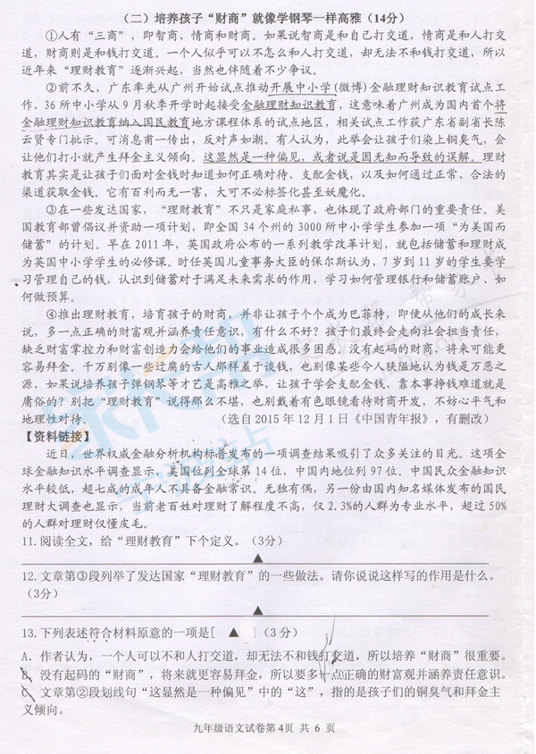 鄞州区2015学年初三第一学期期末语文试卷(4)