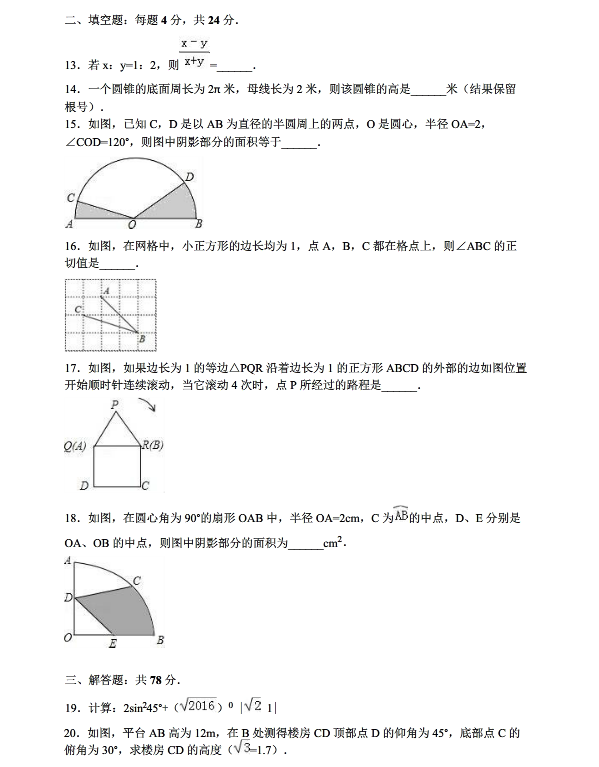宁波鄞州区2015-2016学年初三上期末数学试卷(3)