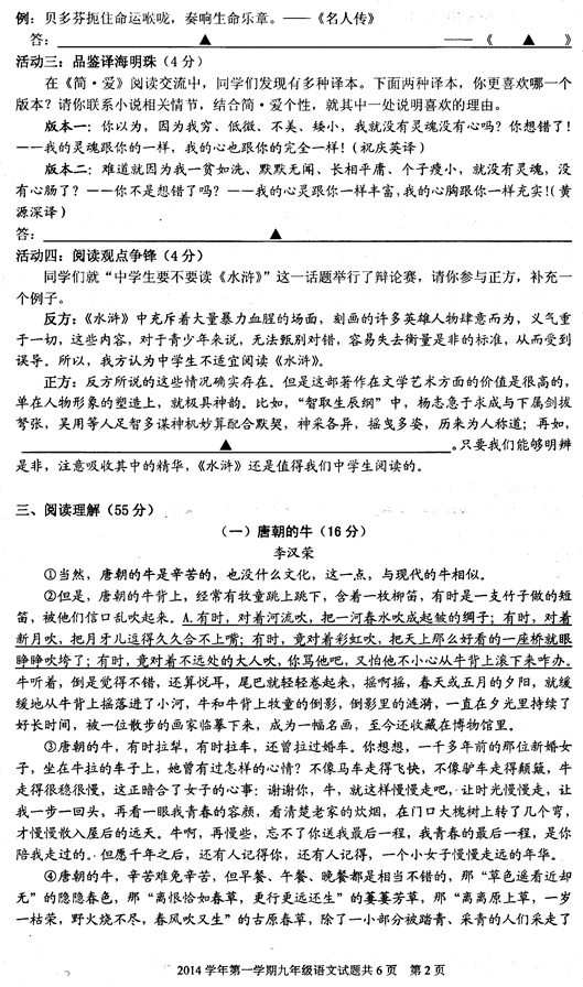 2014-2015学年宁波海曙区第一学期九年级期末语文试题(3)