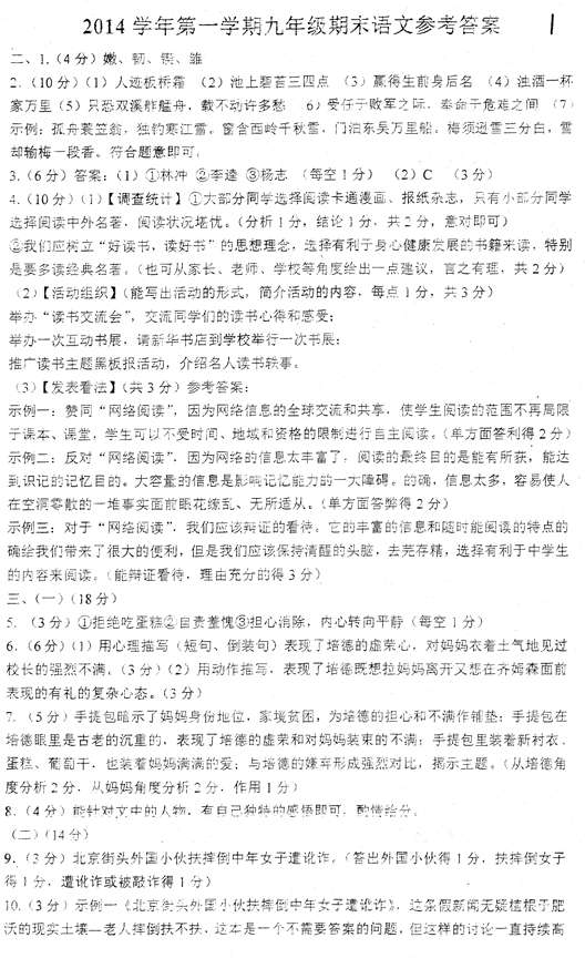 2014-2015学年宁波南三县第一学期九年级期末语文试题答案